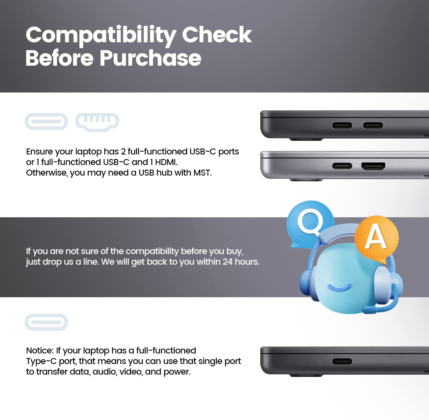 📟Compatibility--The laptop monitor is compatible with Windows, Chrome, Mac & Switch. No driver download needed. It requires 2 USB-C ports or 1 USB-C port plus 1 HDMI port or 2 HDMI ports plus 2 USB-A ports on your laptop. Please make sure your device has required ports and if it doesn't have, please contact us directly. We will offer you a solution in 24hrs.